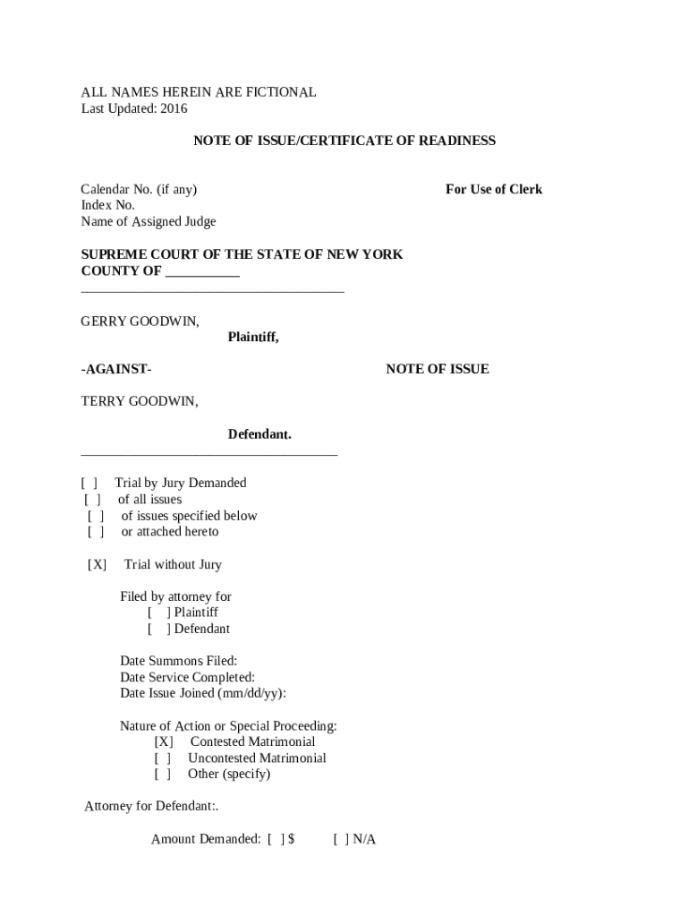 NOTE OF ISSUE/CERTIFICATE OF READINESSCalendar No. (if any) For Use of Clerk Index No.Name of Assigned JudgeSUPREME COURT OF THE STATE OF NEW YORKCOUNTY OF ___ ___GERRY GOODWIN,Plaintiff,AGAINSTTERRY