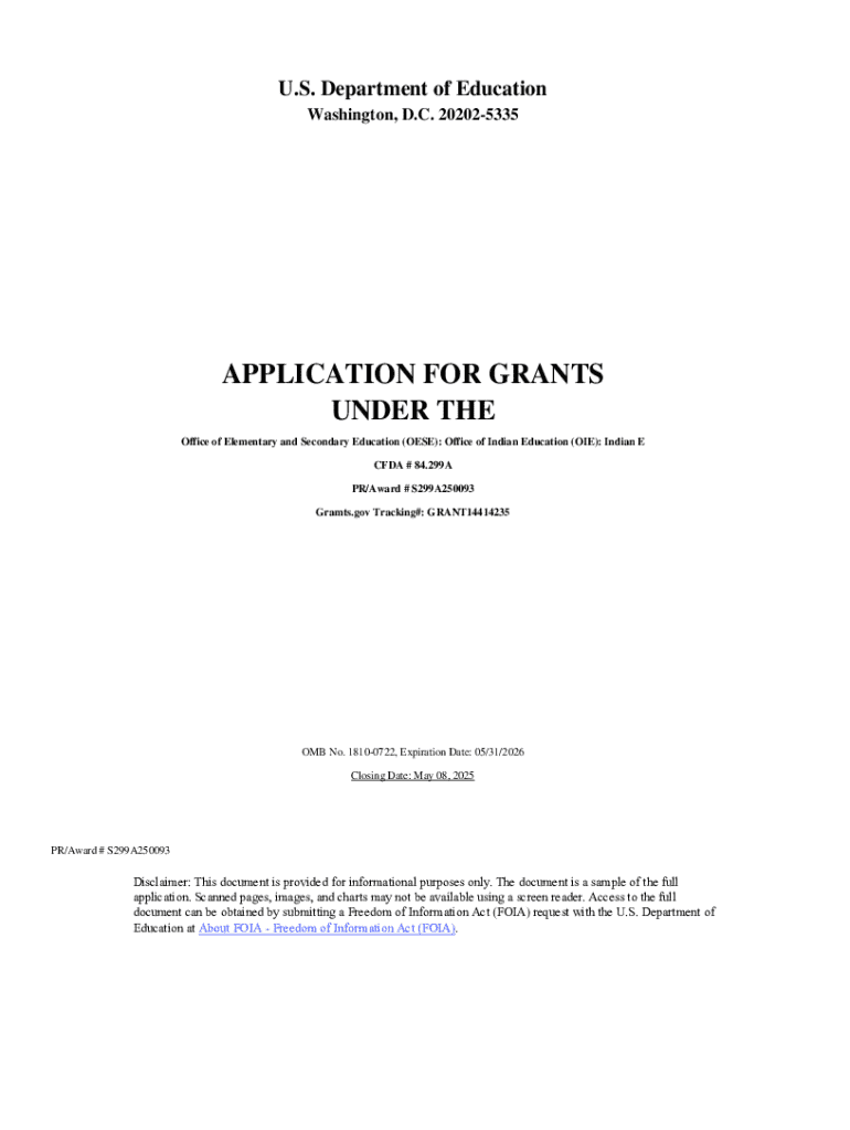 U.S. Department of Education Washington, D.C. 202025335APPLICATION FOR GRANTS UNDER THE Office of Elementary and Secondary Education (OESE): Office of Indian Education (OIE): Indian E CFDA # 84.299A