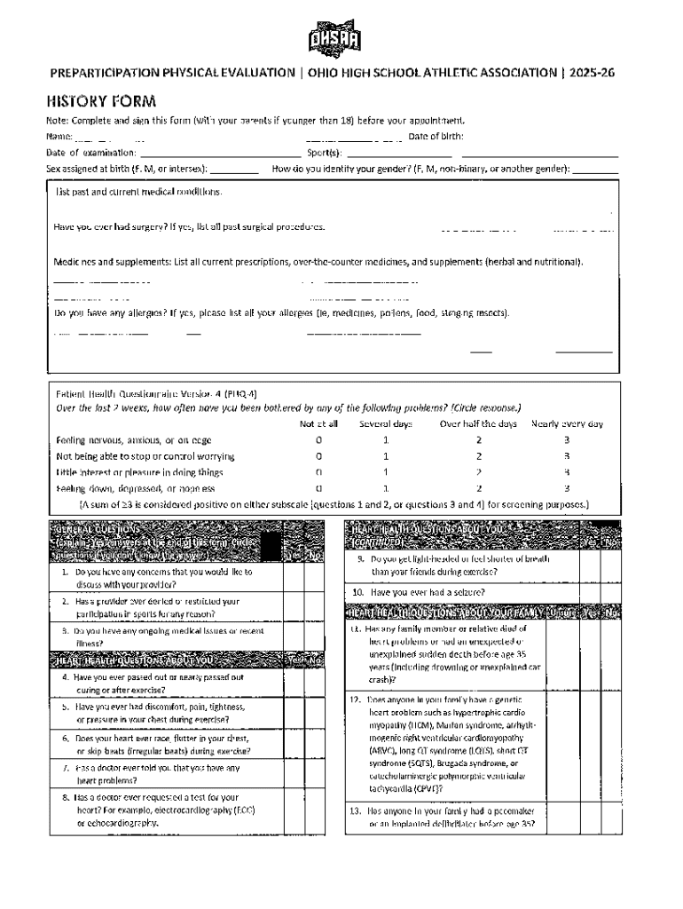 The Ohio High School Athletic Association Preparticipation Physical Evaluation includes several critical components. The medical history section is designed to collect comprehensive details about previous health issues, surgeries, and current medications.