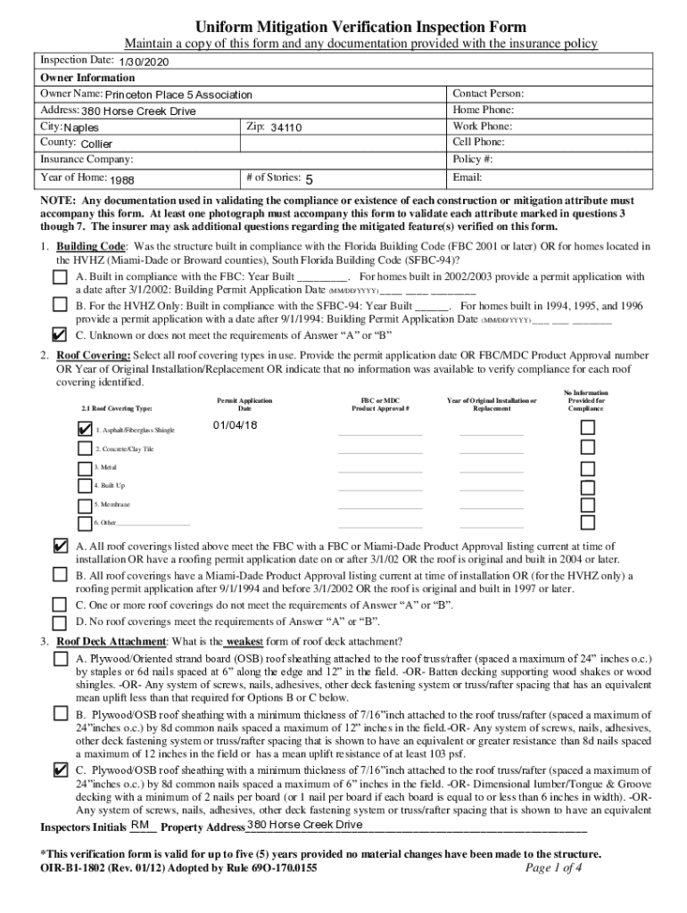 Uniform Mitigation Verification Inspection Form Maintain a copy of this form and any documentation provided with the insurance policy Inspection Date: 1/30/2020 Owner Information Owner Name: Princeton