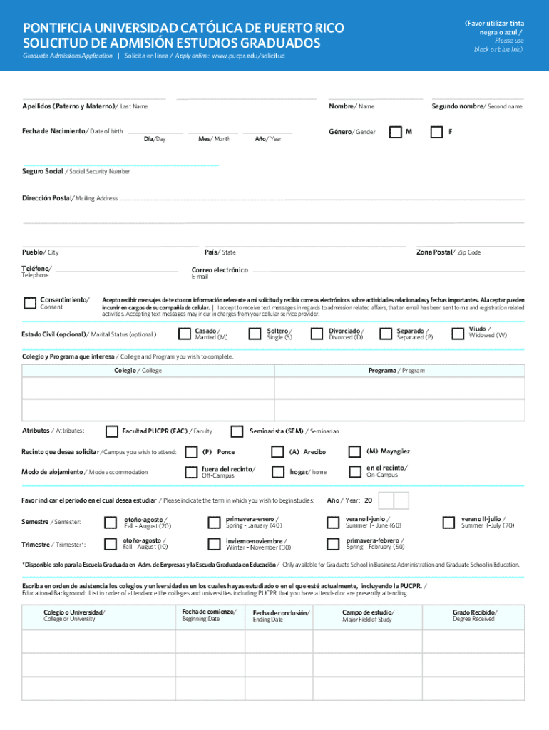 La Solicitud de Admisión de Graduados es un formulario utilizado por solicitantes para inscribirse en estudios de posgrado en la Pontificia Universidad Católica de Puerto Rico.