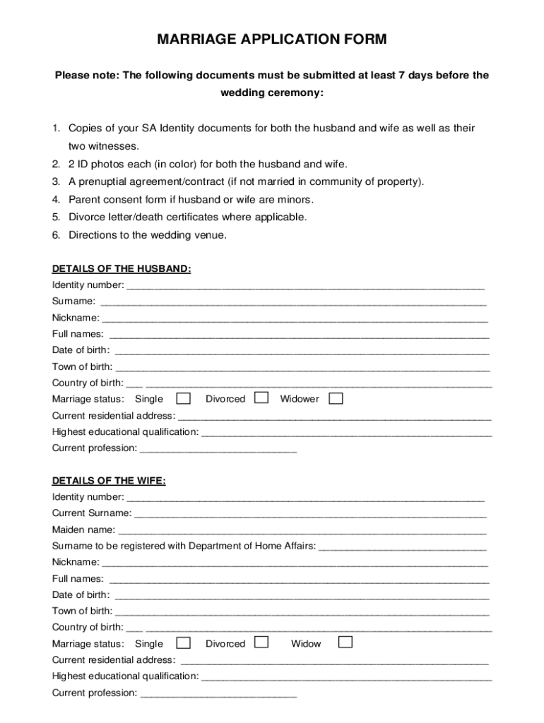 The Marriage Application Form is a legal document used by individuals in South Africa to apply for a marriage license.