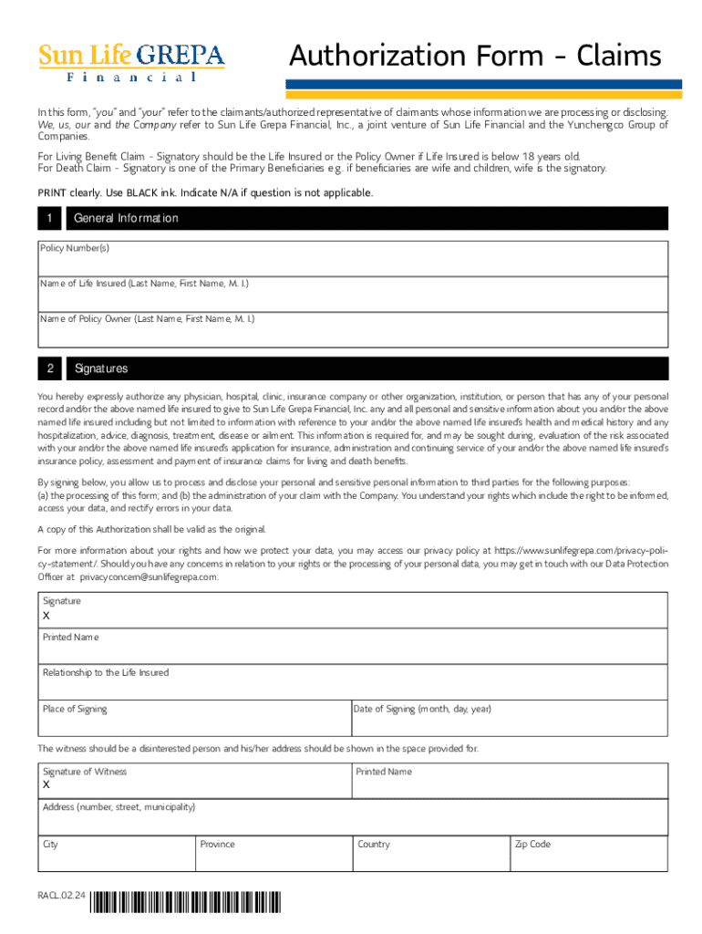 The Sun Life Grepa Authorization Form must be filled out by claimants and their representatives. It is particularly necessary in situations where personal information is required for insurance claims in the Philippines. This includes cases where additional medical information is involved or when a representative is filing on behalf of a claimant.