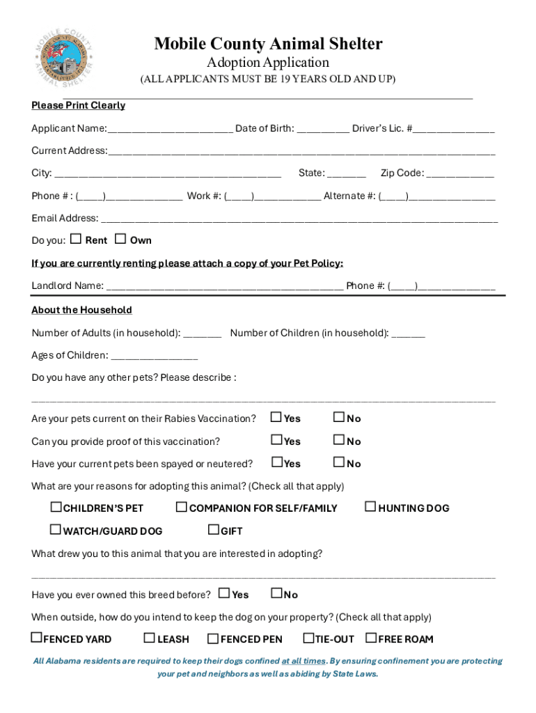 Individuals aged 19 and older who are residents of Alabama can apply for pet adoption using this form.