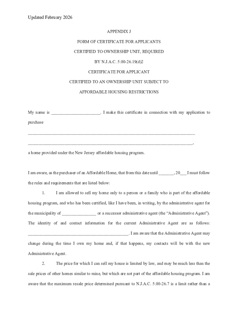 The New Jersey Affordable Housing Certificate is a legal document used by home purchasers to certify compliance with affordable housing program requirements.