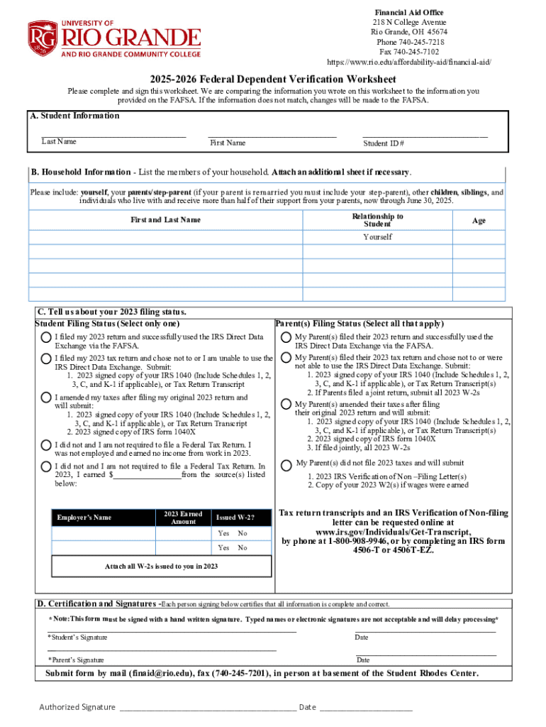 Financial Aid Office 218 N College Avenue Rio Grande, OH 45674 Phone 7402457218 Fax 7402457102 https://www.rio.edu/affordabilityaid/financialaid/20252026 Federal Dependent Verification WorksheetPlease