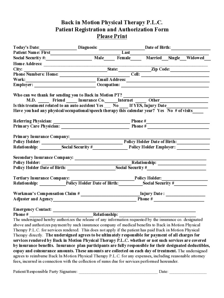 Any new patient or responsible party requesting physical therapy services should complete this form to provide necessary personal and insurance information.