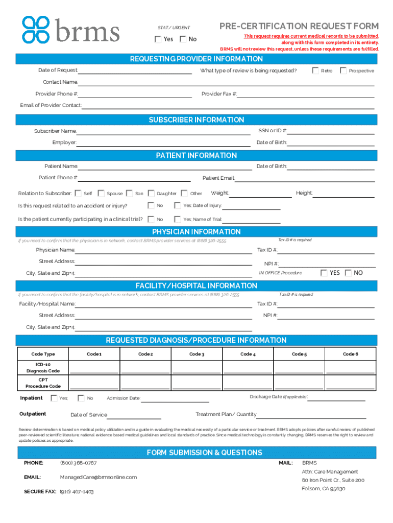 PRECERTIFICATION REQUEST FORMSTAT/ URGENTYesThis request requires current medical records to be submitted, along with this form completed in its entirety. BRMS will not review this request, unless