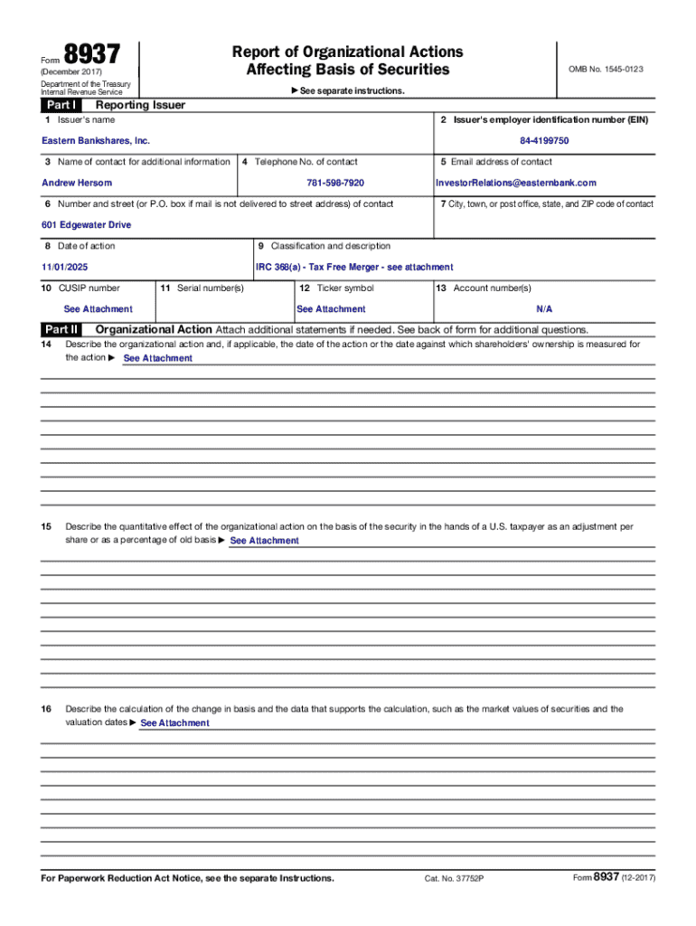 Form 8937 is a tax document essential for U.S. taxpayers involved in securities transactions. It serves as a formal method to report "organizational actions" such as changes in corporate structure that influence the basis of securities. The form includes critical information such as the issuer's name, Employer Identification Number (EIN), contact details, and the date of the action taken.