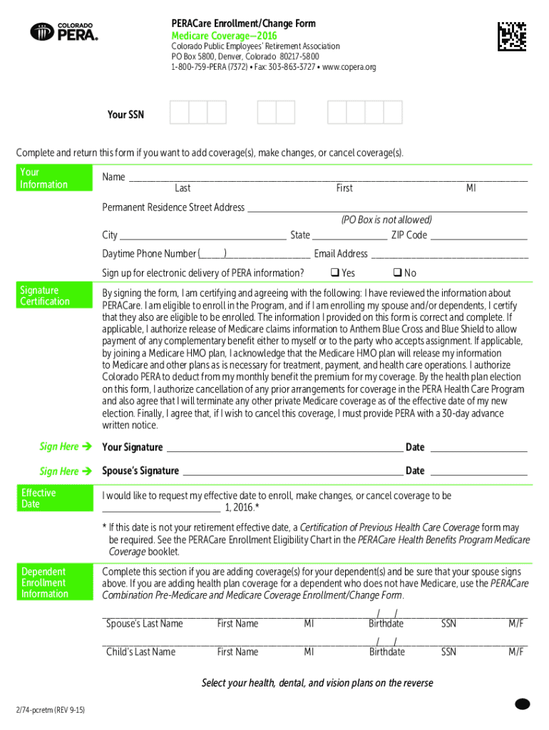 PERACare Enrollment/Change Form Medicare Coverage2016 Colorado Public Employees Retirement Association PO Box 5800, Denver, Colorado 802175800 1800759PERA (7372)Fax: 3038633727www.copera.orgYour SSN