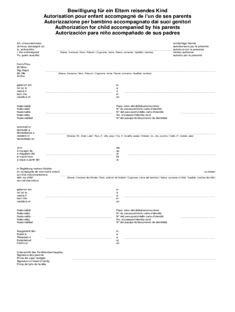 Bewilligung fr ein Eltern reisendes Kind Autorisation pour enfant accompagn de lun de ses parents Autorizzazione per bambino accompagnato dai suoi genitori Authorization for child accompanied by his