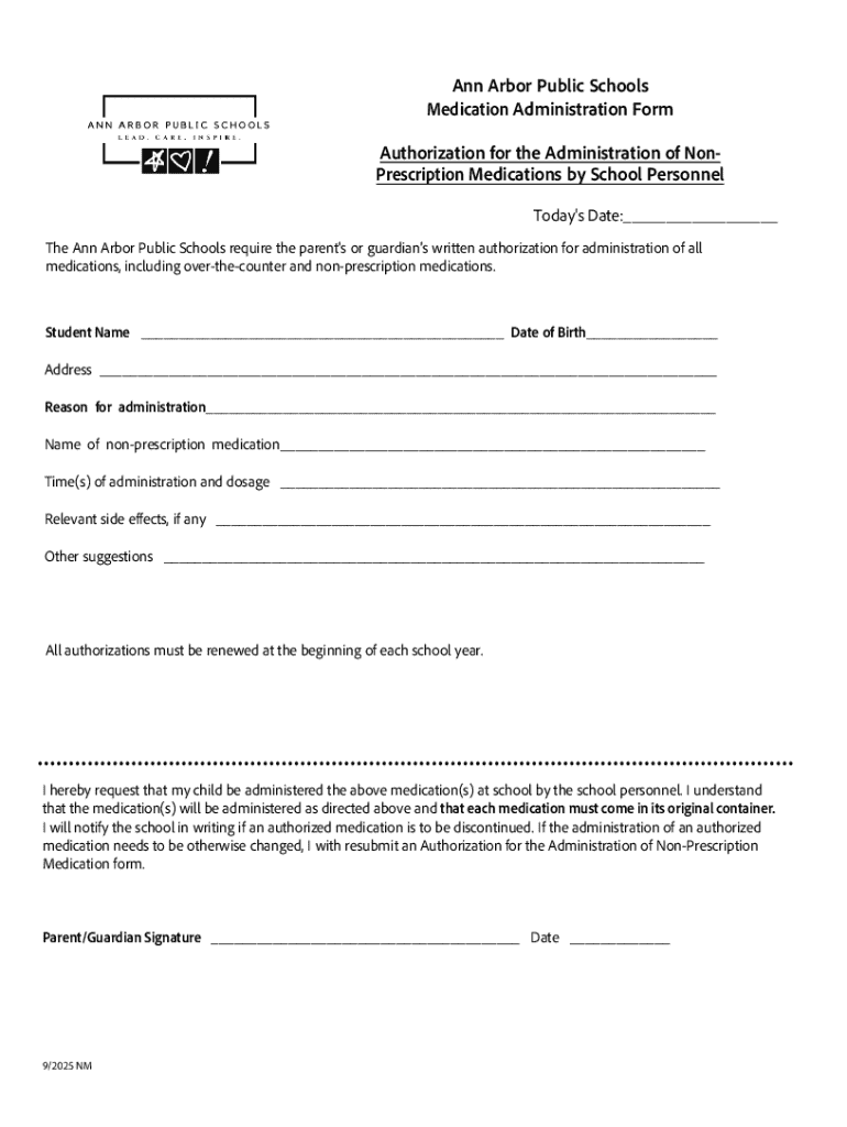 Renewal and Updates for the Ann Arbor Public Schools Medication Authorization Form