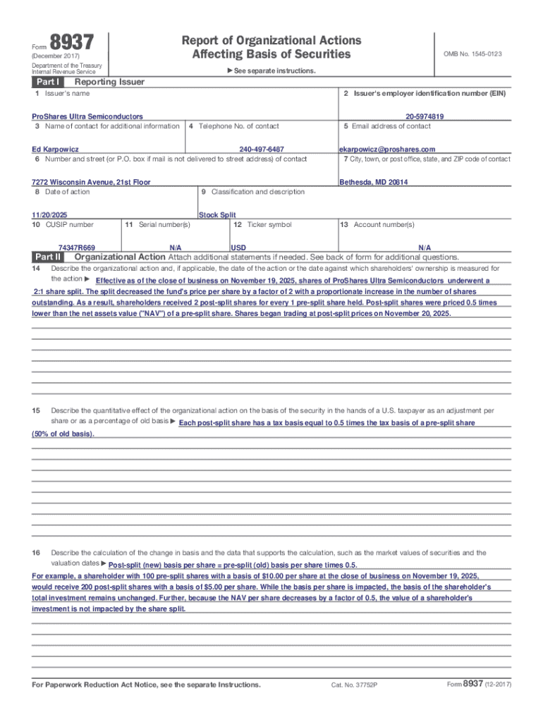 The IRS Form 8937 Report is a crucial document that reports organizational actions affecting the basis of securities. This form plays a significant role in ensuring that U.S. taxpayers receive accurate information regarding their tax basis for different securities. The report requires a signature from the treasurer and includes essential fields that must be filled out to maintain compliance with IRS regulations.
