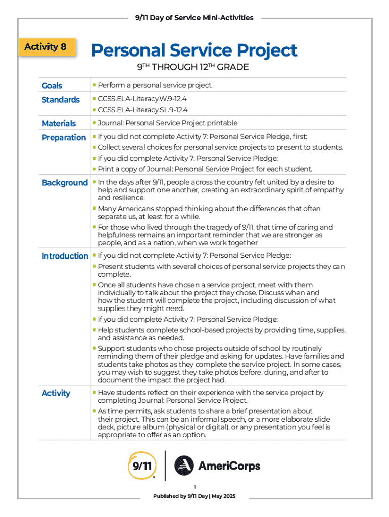 9/11 Day of Service MiniActivitiesActivity 8Personal Service Project 9TH THROUGH 12TH GRADEGoalsPerform a personal service project.Standards CSS.ELALiteracy.W.912.4 C CCSS.ELALiteracy.SL.912.4MaterialsJournal: