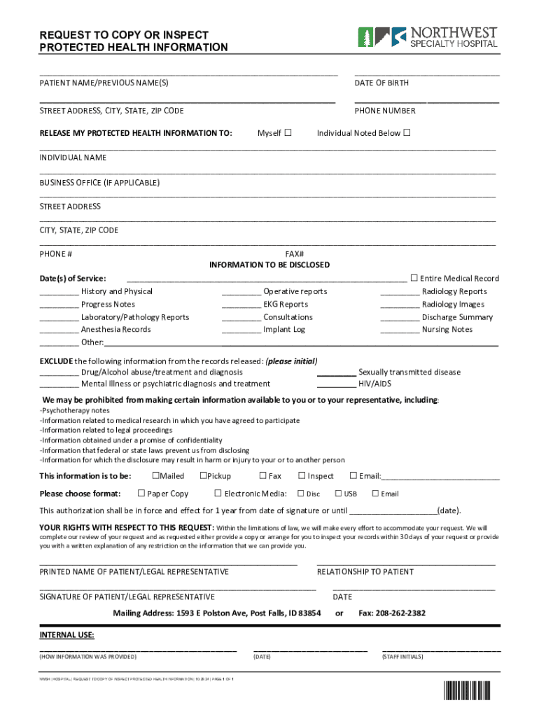 The Request to Copy or Inspect Protected Health Information is a crucial form in healthcare that allows individuals to access their medical records under the Health Insurance Portability and Accountability Act (HIPAA). Protected health information (PHI) includes any data that relates to an individual's health status, healthcare provision, or payment information that can identify the individual.