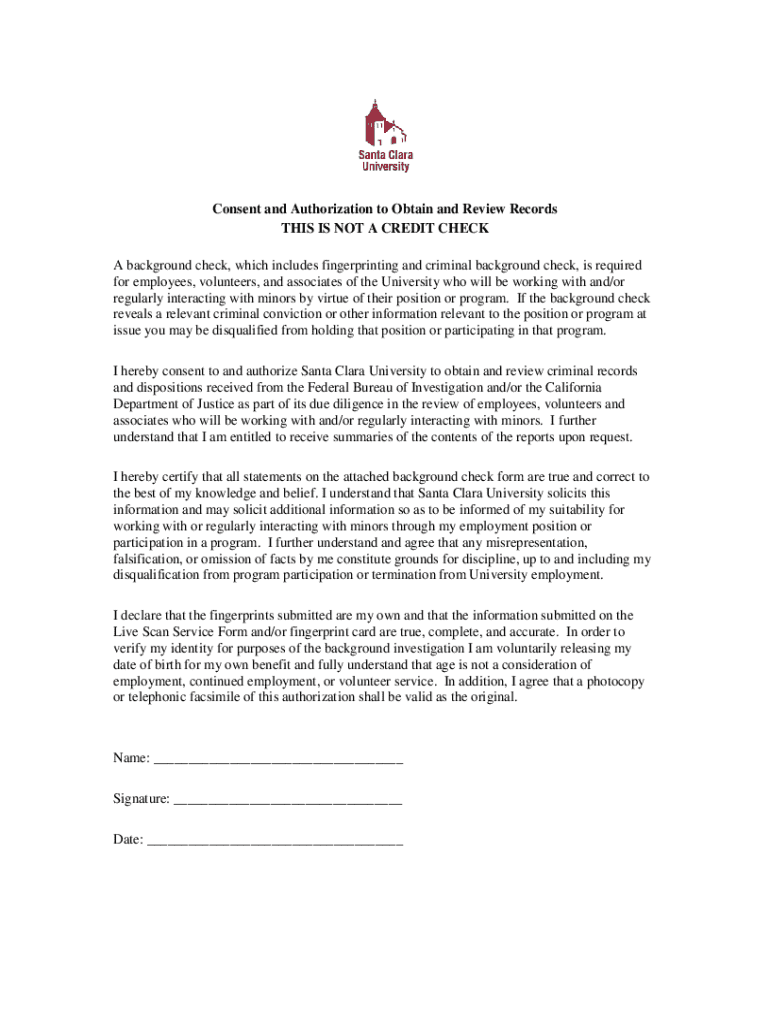 The consent authorization background check is required for a variety of individuals associated with Santa Clara University. This includes applicants applying for positions such as employees, volunteers, and others who are intended to work with minors. Understanding who is required to submit the form is crucial for maintaining a safe environment.