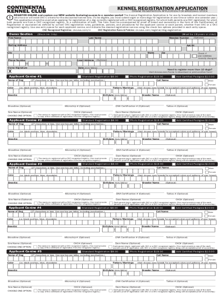 The Canine Registration Application for Breeding Stock serves a vital role for breeders and kennel members, enabling them to register their dogs with the Continental Kennel Club (CKC). This registration is essential in establishing authenticity and recognition for breeding practices. Ensuring dogs are officially registered helps uphold breed standards and provides critical information for prospective buyers and other breeders.