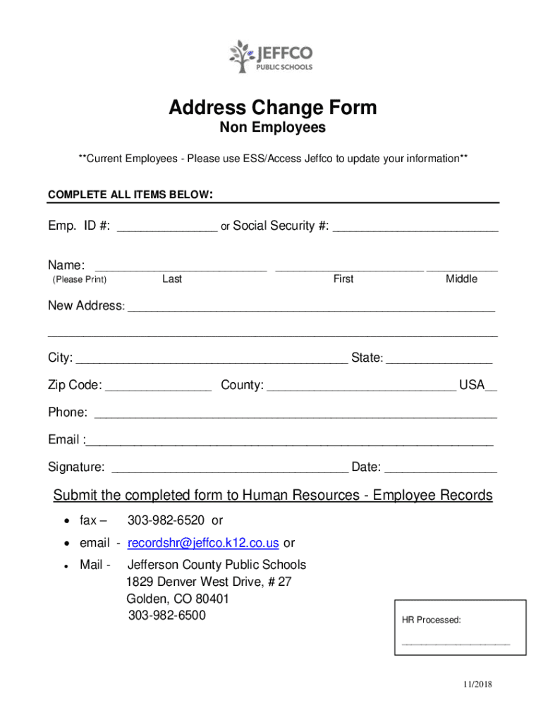 Address Change Form Non Employees **Current EmployeesPlease use ESS/Access Jeffco to update your information** COMPLETE ALL ITEMS BELOW:Emp. ID #: ___ or Social Security #: ___ Name: ___ ___ ___ (Please