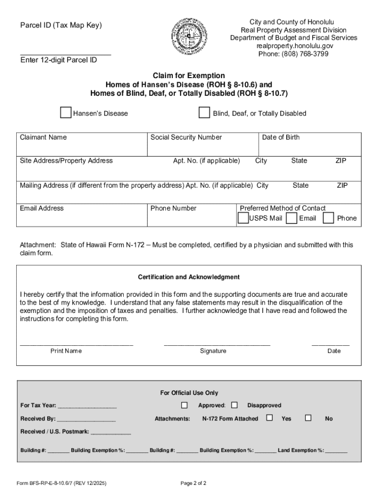 Information and Instructions Claim for ExemptionHomes of Hansens Disease Claim for ExemptionHomes of Blind, Deaf, or Totally Disabled Revised Ordinances of Honolulu (\"ROH\")810.6 and 810.7 1. Filing