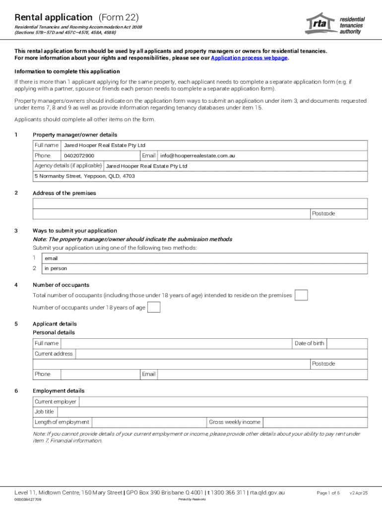 Rental application (Form 22) Residential Tenancies and Rooming Accommodation Act 2008 (Sections 57B57D and 457C457E, 458A, 458B)This rental application form should be used by all applicants and property