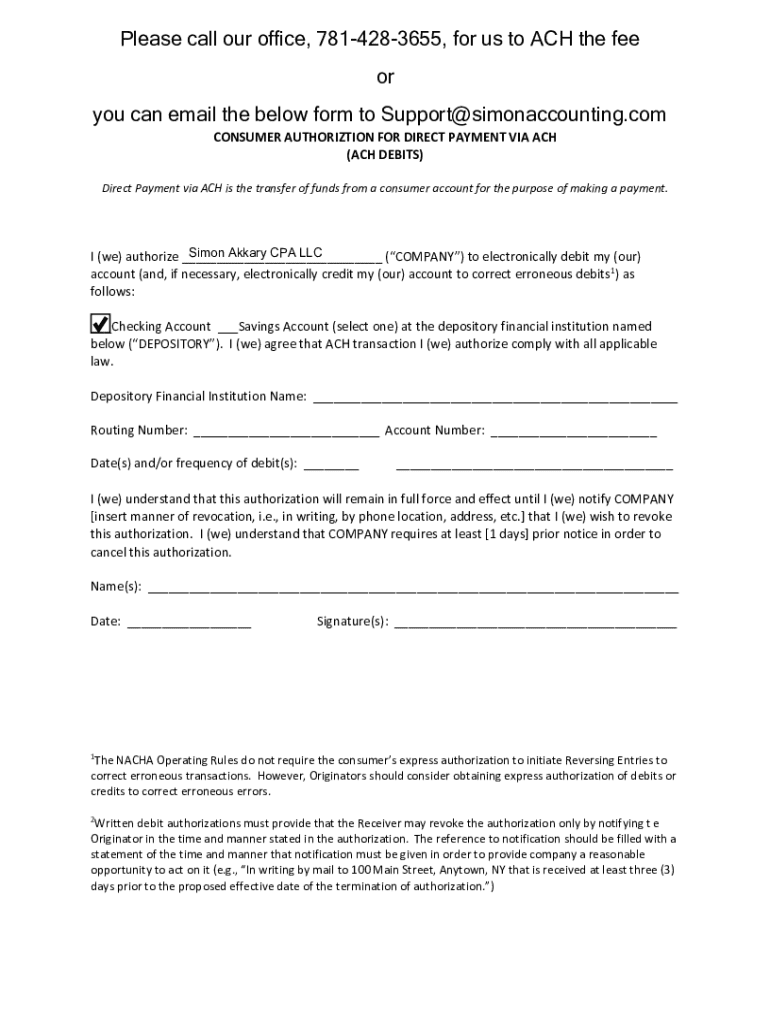 Get the free Consumer Authorization for Direct Payment via ACH