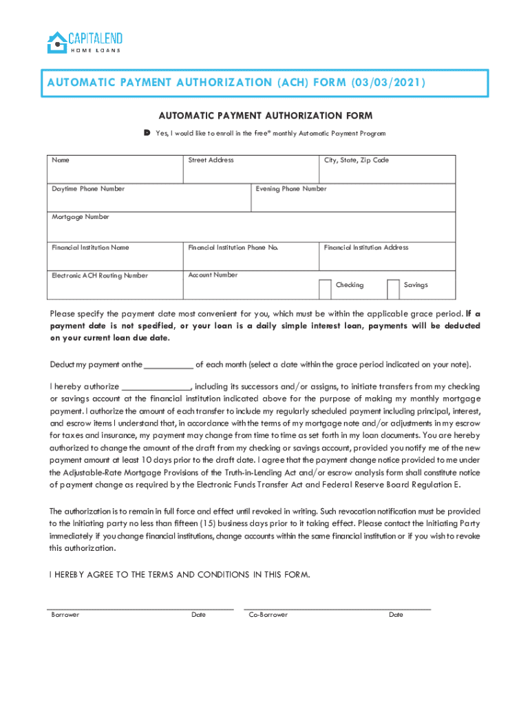 The Automatic Payment Authorization Form is a financial document used by borrowers to enroll in an automatic monthly mortgage payment program.