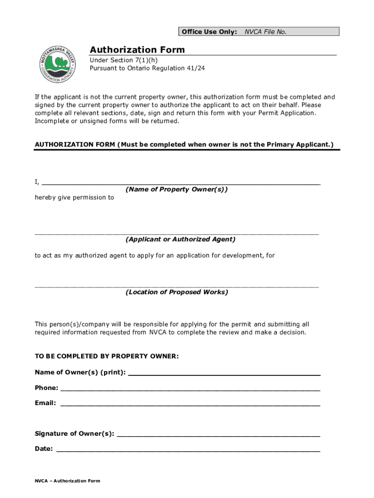 The Authorization Form is a legal document used by property owners in Ontario, Canada, to authorize an applicant to represent them in securing a development permit.