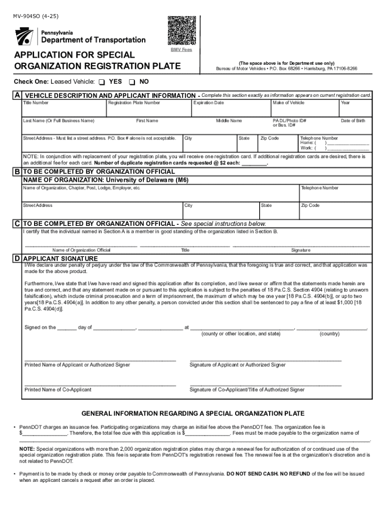 The Pennsylvania Special Organization Registration Plate Application, also known as the MV-904SO, is designed for nonprofit organizations seeking to acquire special registration plates in Pennsylvania. This application form plays a crucial role in helping these organizations promote their cause effectively. By obtaining a special organization plate, nonprofits can enhance their visibility and instill community support for their missions.