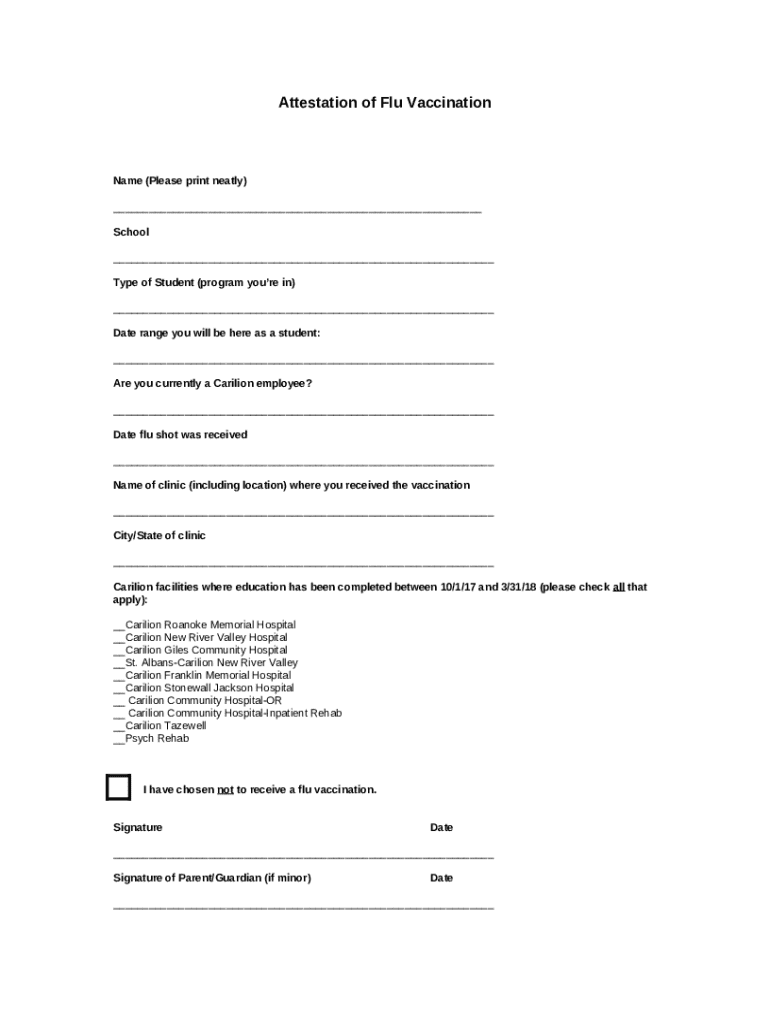 The Attestation of Flu Vaccination is a healthcare form used by students to confirm receiving a flu vaccination or opting out of it.