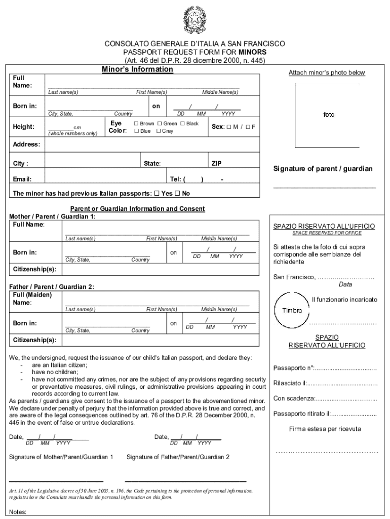 CONSOLATO GENERALE DITALIA A SAN FRANCISCO PASSPORT REQUEST FORM FOR MINORS (Art. 46 del D.P.R. 28 dicembre 2000, n. 445)Minors Information Full Name:___ Last name(s)Born in:First Name(s)___cm (whole