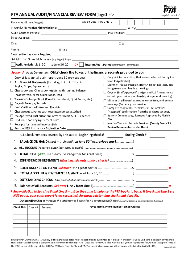 The Florida PTA Annual Audit Form must be completed and submitted annually. Check with your local PTA for specific deadlines as they may vary.