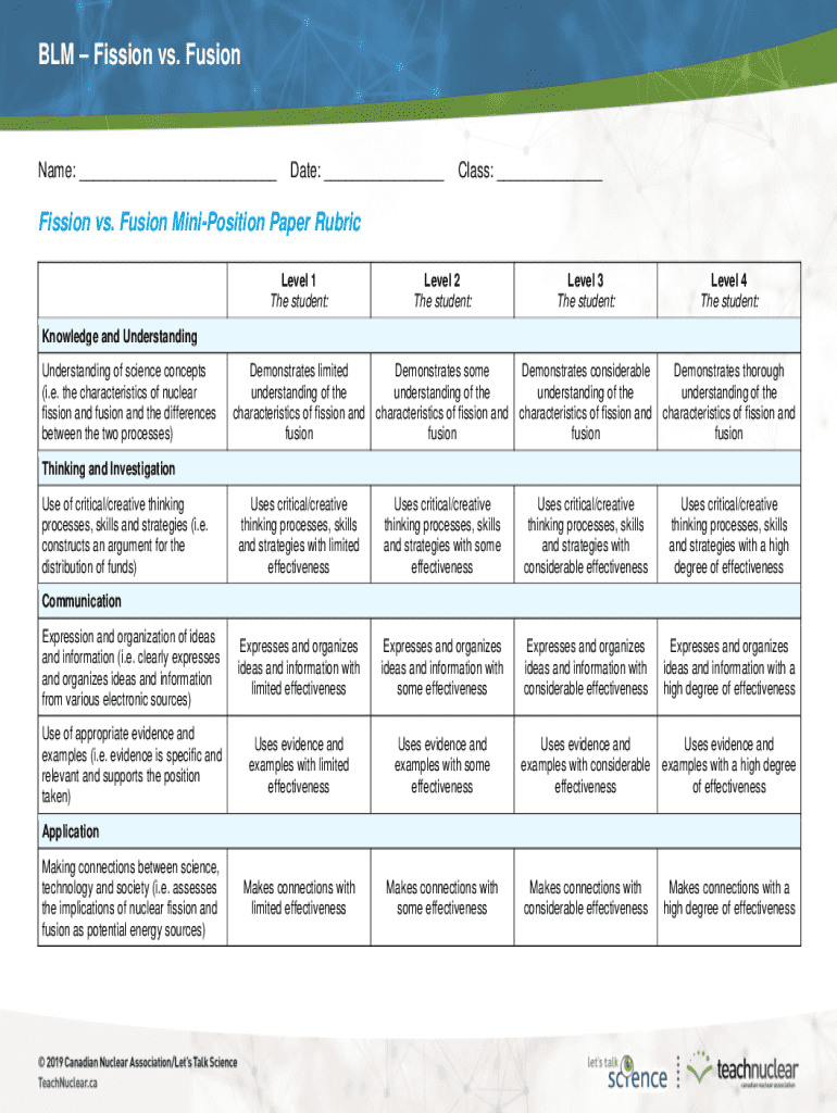 The Fission vs. Fusion Mini-Position Paper Rubric is an educational tool designed for evaluating students' comprehension of nuclear science concepts, specifically nuclear fission and fusion. This rubric plays a critical role in assessing students' knowledge through a structured framework that evaluates four key areas: knowledge, thinking, communication, and application. By employing this specific rubric, educators can ensure consistency in evaluation while promoting a deeper understanding of these complex scientific topics.