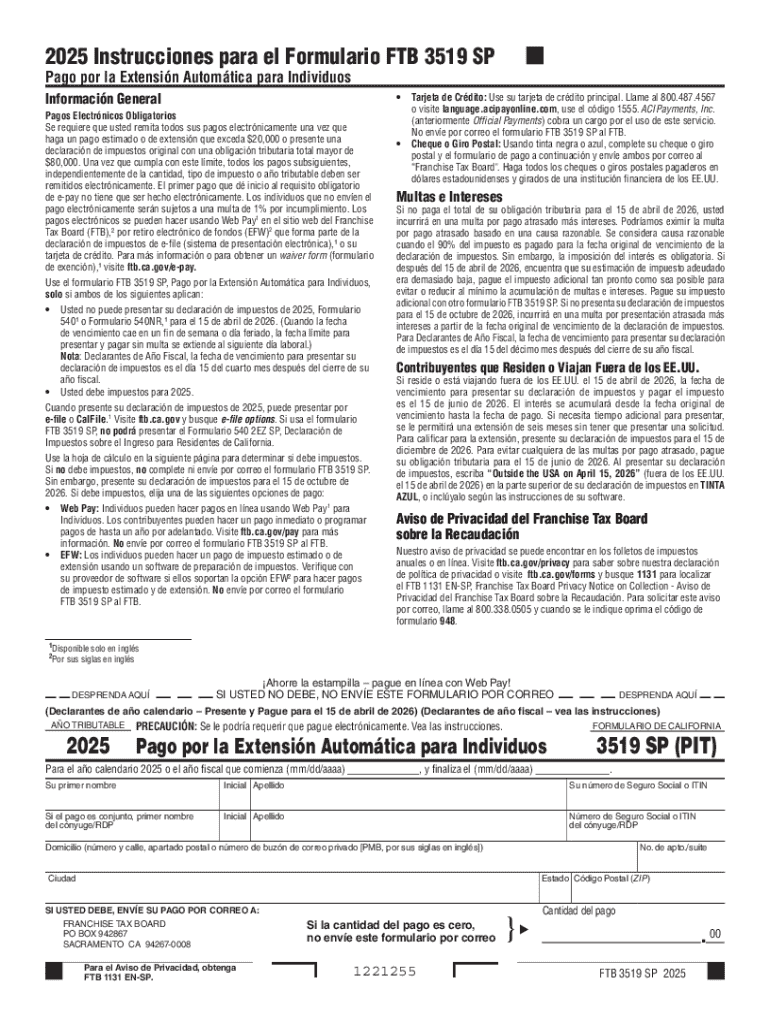 Cualquier contribuyente individual en California que necesite hacer un pago para una extensión automática de impuestos puede utilizar el formulario FTB 3519 SP.