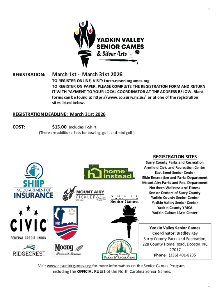 Understanding the financial requirements and deadlines for the Yadkin Valley Senior Games registration is crucial for participants. The registration fee is $15.00, which includes a T-shirt. Registration will be open from March 1 to March 31, 2026.