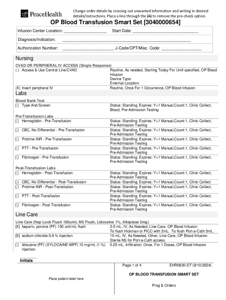 Change order details by crossing out unwanted information and writing in desired details/instructions. Place a line through the [X] to remove the precheck option.OP Blood Transfusion Smart Set [3040000654]