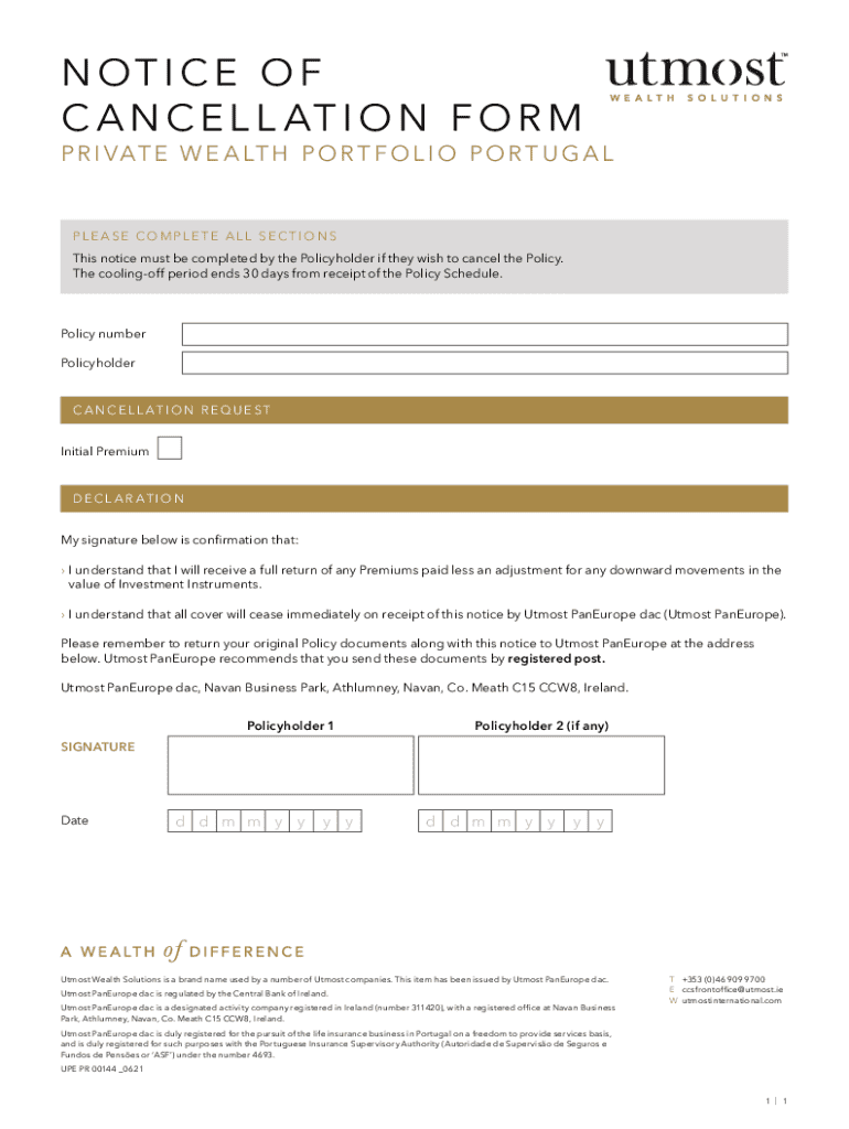 The Portugal Private Wealth Portfolio Cancellation Form is a service agreement used by policyholders to formally request the cancellation of their policy during the cooling-off period.