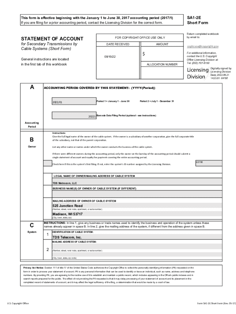 The US Copyright Office Form SA1-2E is a short form statement of account crucial for cable system owners in the U.S. This form serves to report secondary transmissions and related services to the Copyright Office. Compliance with U.S. copyright regulations is paramount, and this form plays an essential role in ensuring adherence.