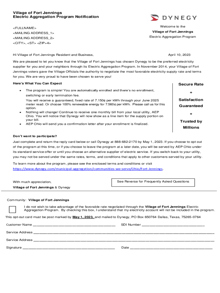 This notification is essential for all residents and businesses within the Village of Fort Jennings. Participation in the Electric Aggregation Program is based on specific eligibility criteria, allowing individuals to benefit from the preferred supplier’s offerings. It is particularly relevant for those individuals considering opting out of the program, as well as those eager to enroll actively.