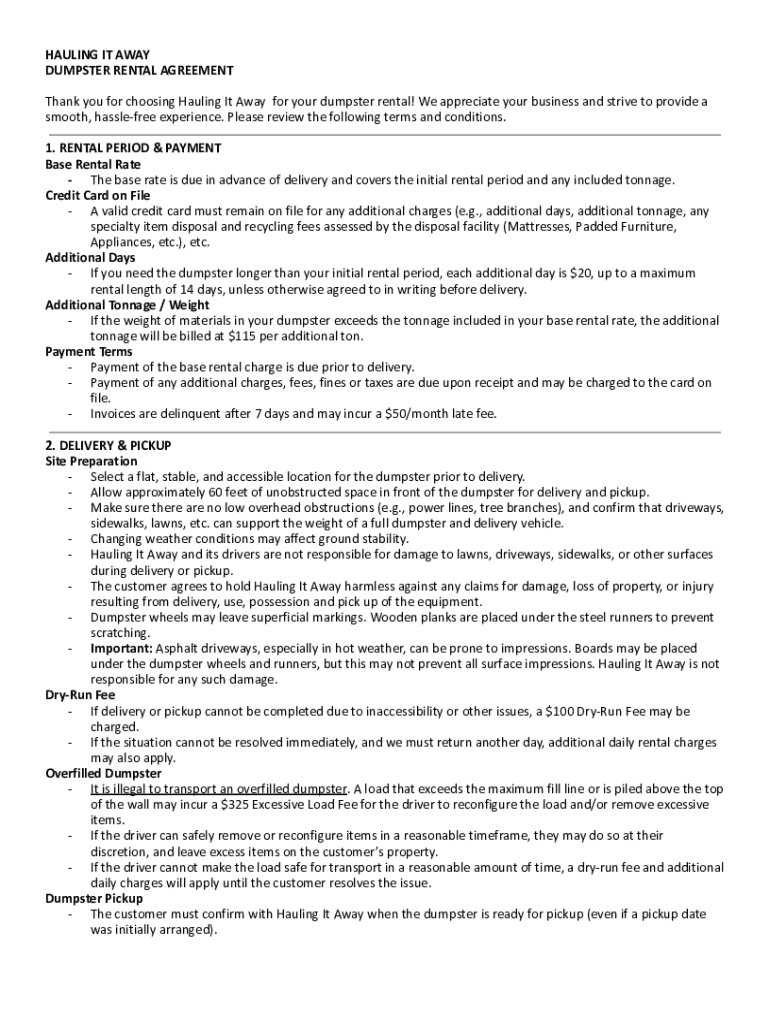 The Dumpster Rental Agreement is a service agreement used by Hauling It Away to formalize the rental of dumpsters for waste disposal and management purposes.