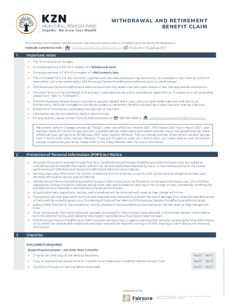Eligibility for using this form is limited to members of the KZN Municipal Pension Fund who are seeking to withdraw from the fund or are retiring.