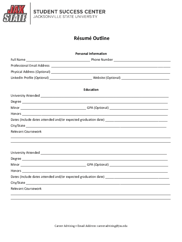 Rsum Outline Personal Information Full Name ___ Phone Number ___ Professional Email Address ___ Physical Address (Optional) ___ LinkedIn Profile (Optional) ___ Website (Optional) ___ Education University