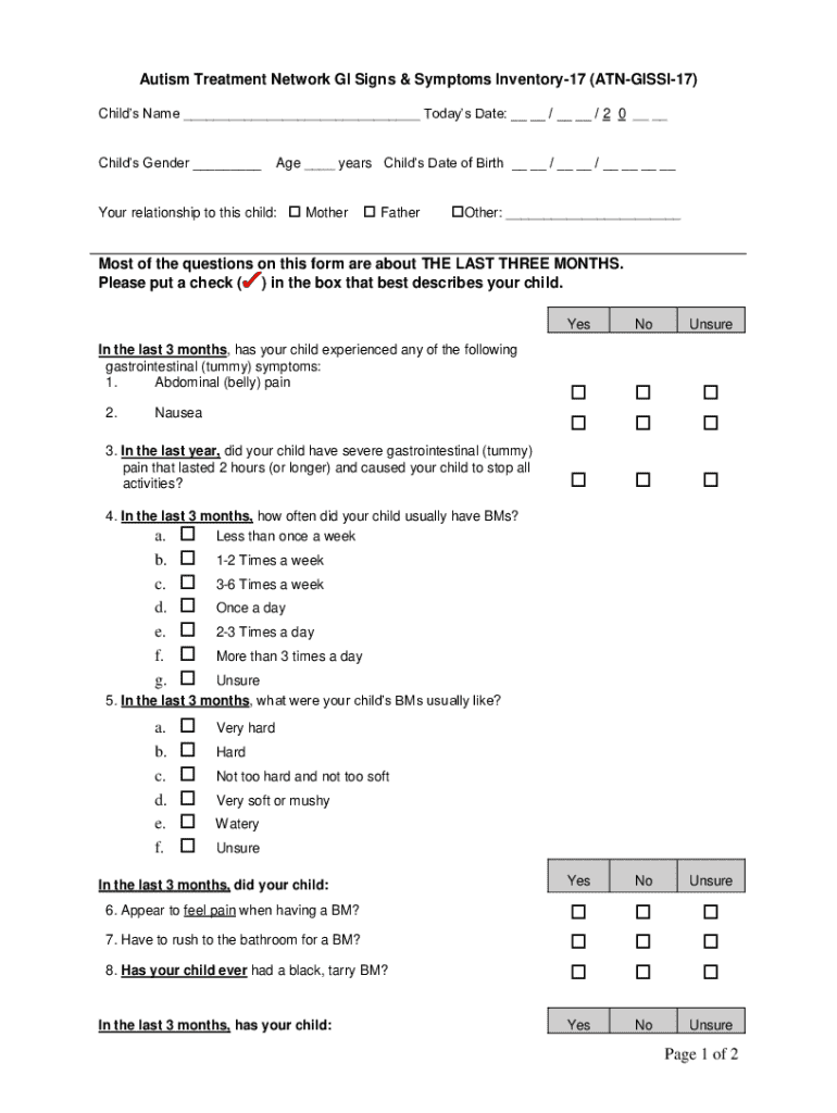 Autism Treatment Network GI Signs & Symptoms Inventory17 (ATNGISSI17) Childs Name ___ Todays Date: __ __ / __ __ / 2 0 __ __ Childs Gender ___Age ___ years Childs Date of Birth __ __ / __ __ / __