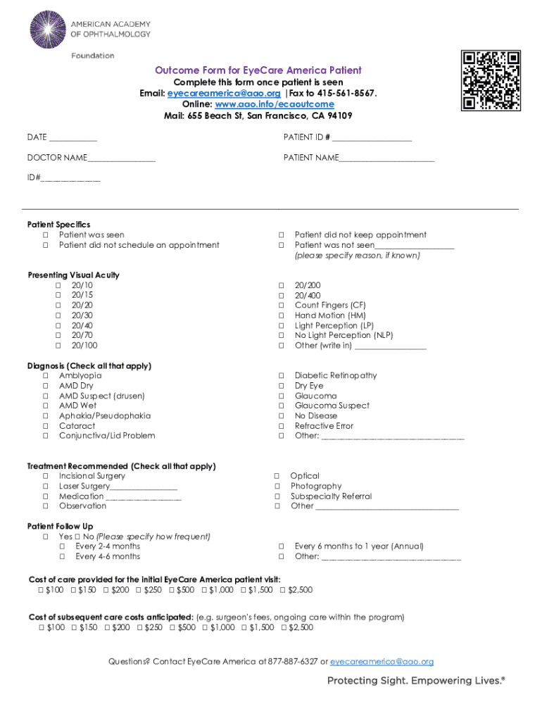 The EyeCare America Patient Outcome Form is designed for healthcare providers involved in the EyeCare America program and their patients who receive care under this initiative.