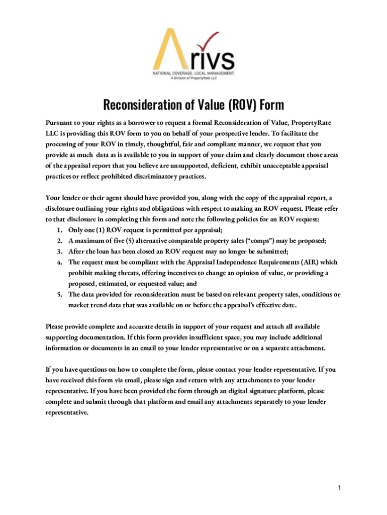 The ROV Form can be submitted by borrowers who believe there are errors in their property appraisal, as well as lenders or agents acting on their behalf.
