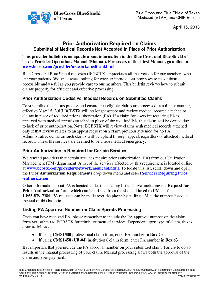 Medicaid (STAR) and CHIP Bulletin April 15, 2013Prior Authorization Required on Claims