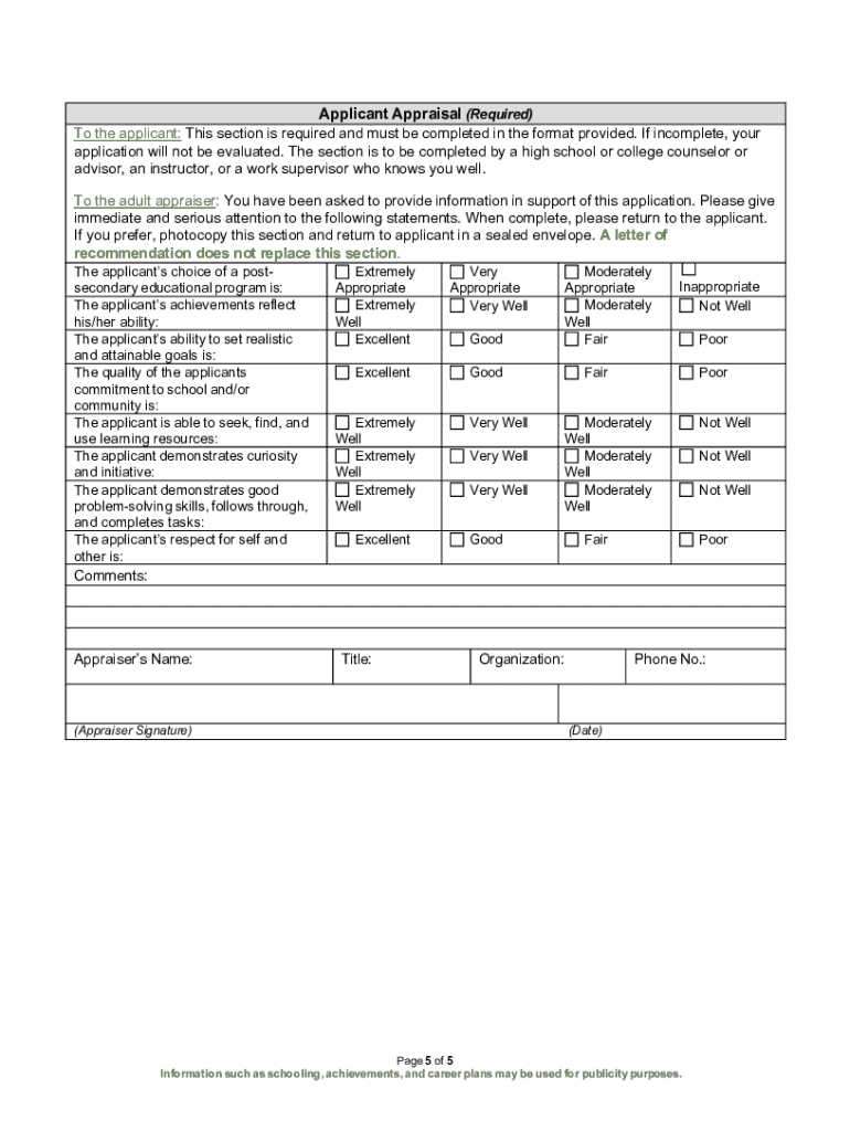 Applicant Appraisal (Required) To the applicant: This section is required and must be completed in the format provided. If incomplete, your application will not be evaluated. The section is to be