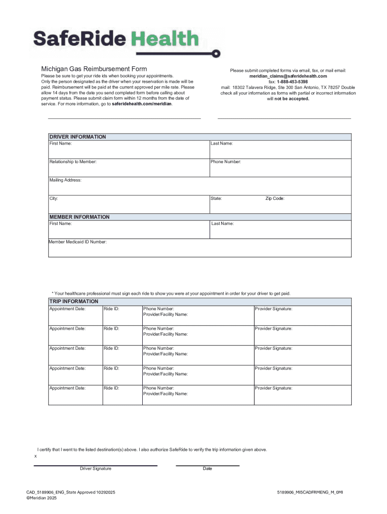 Michigan Gas Reimbursement FormPlease submit completed forms via email, fax, or mail email: meridian_claims@saferidehealth.com fax: 18884535398 mail: 18302 Talavera Ridge, Ste 300 San Antonio, TX