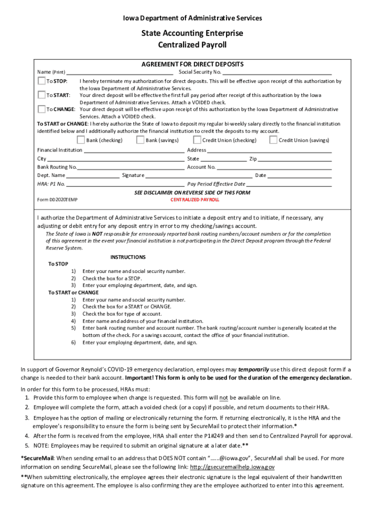 Submission and Processing of the Iowa Direct Deposit Agreement