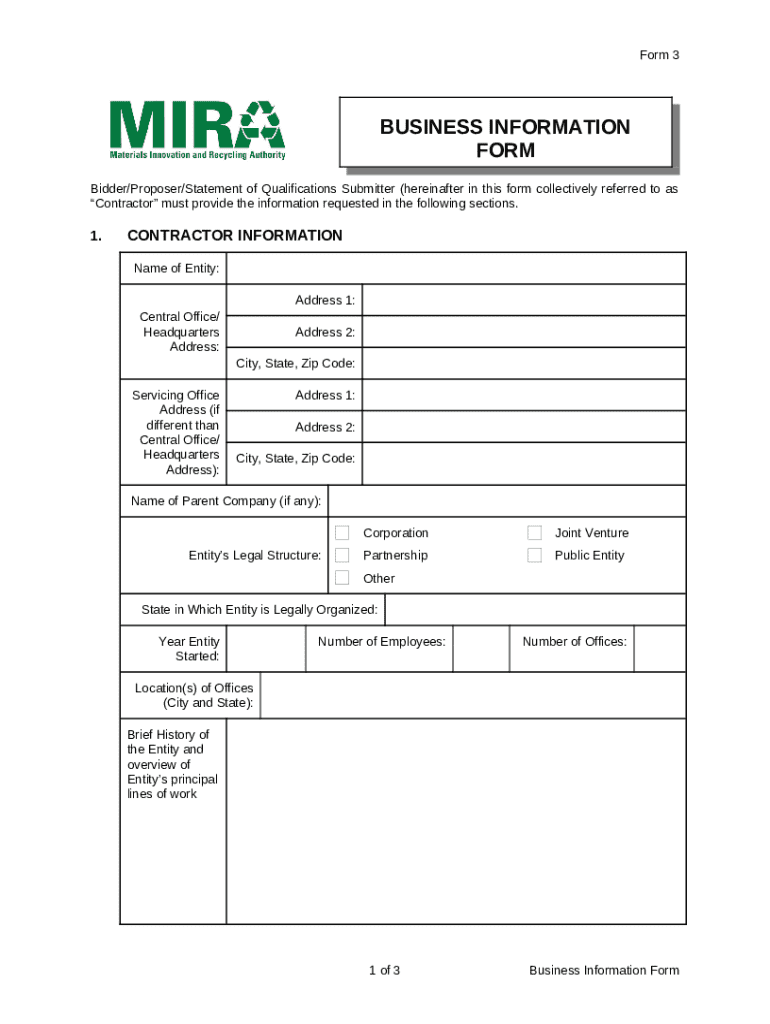 The Form 3 Business Information Form should be completed by contractors or businesses that wish to bid on projects and respond to Requests for Proposals (RFPs).