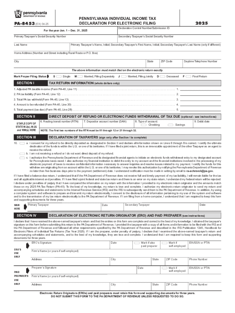 The Pennsylvania Individual Income Tax Declaration for Electronic Filing (PA-8453) is a state tax form used by individuals to declare their electronic filing for the 2025 tax year.